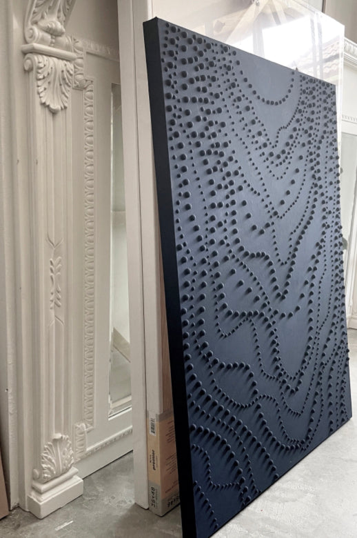 Every “pearl” is hand poured on canvas, and the shadows shifts with the light, creating different looks throughout the day.